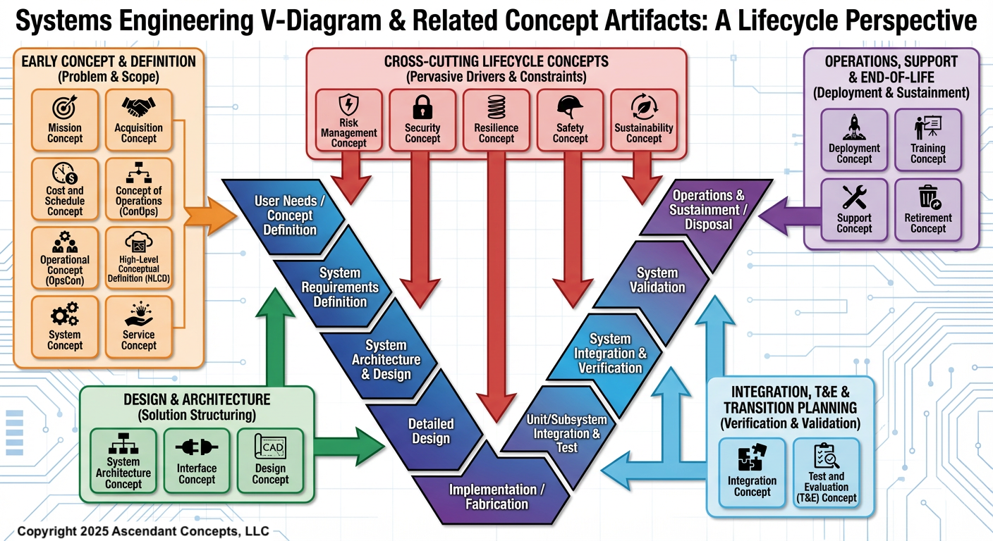 Concepts are fundamental building blocks in Systems Engineering, serving as mental representations that can be shared through words, visualizations, or other media. They are textual or graphical representations that concisely express how an entity can fulfill a problem, threat, or opportunity, and how it provides a business capability in terms of people, processes, and products within specified constraints and acceptable risk. Concepts are central to understanding problems and solutions in systems thinking.