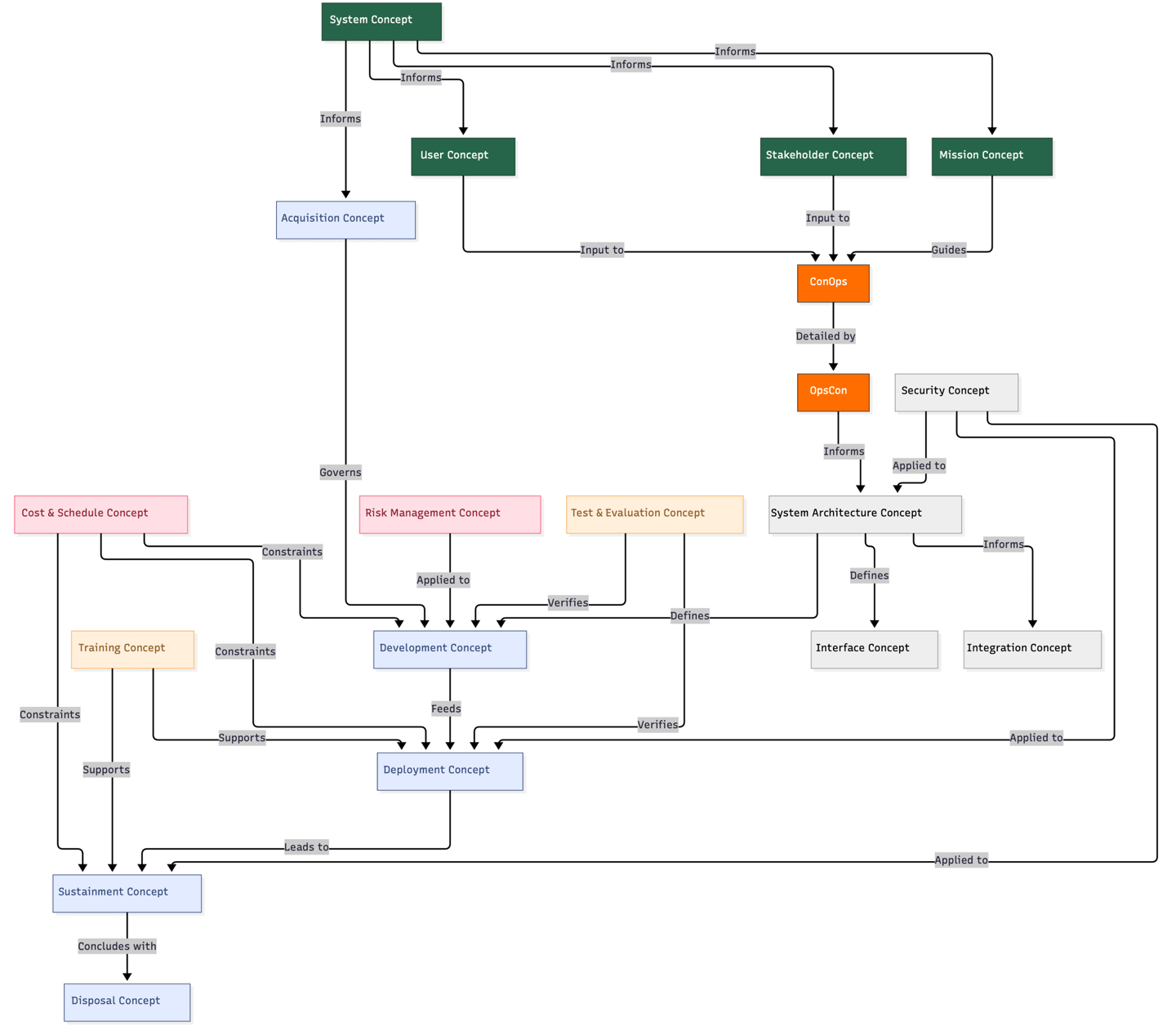 Lifecycle Phases: Acquisition Concept, Development Concept, Deployment Concept, Sustainment Concept, Disposal Concept
